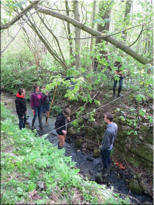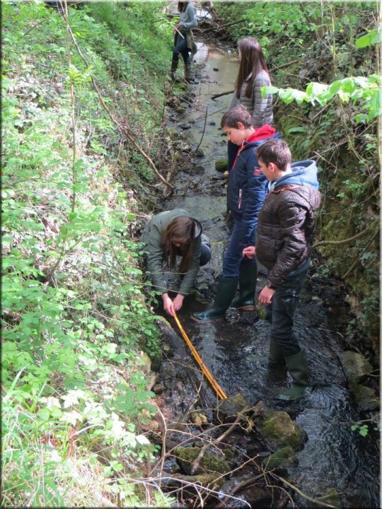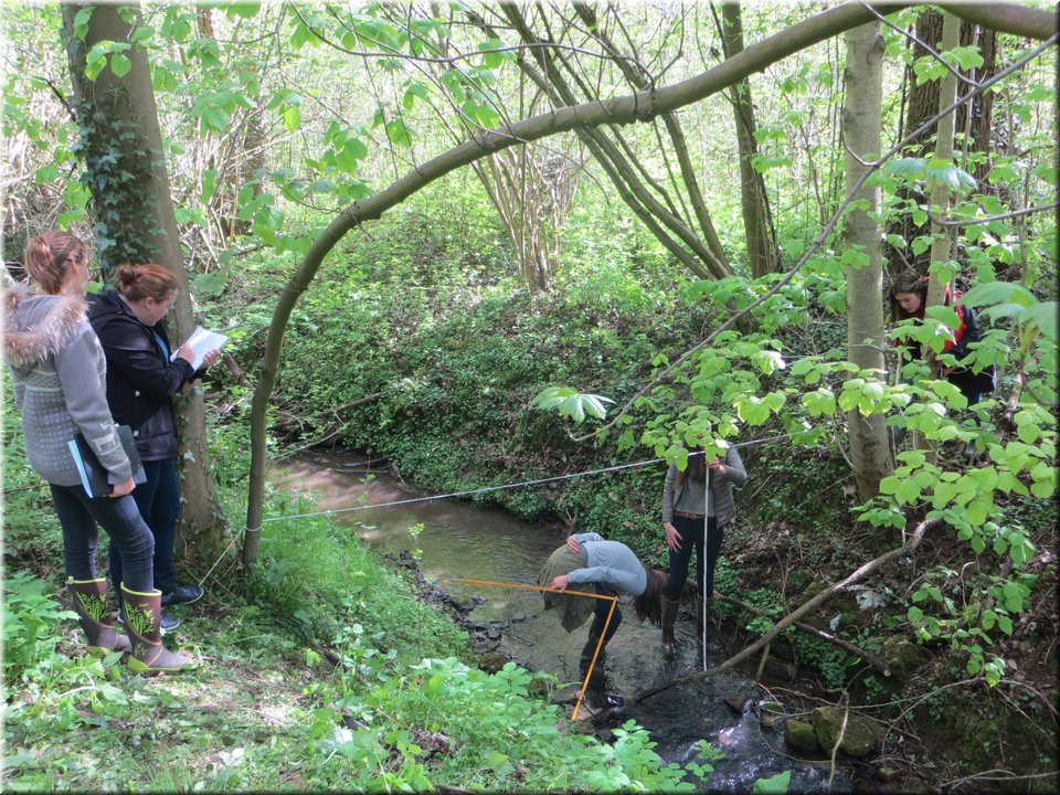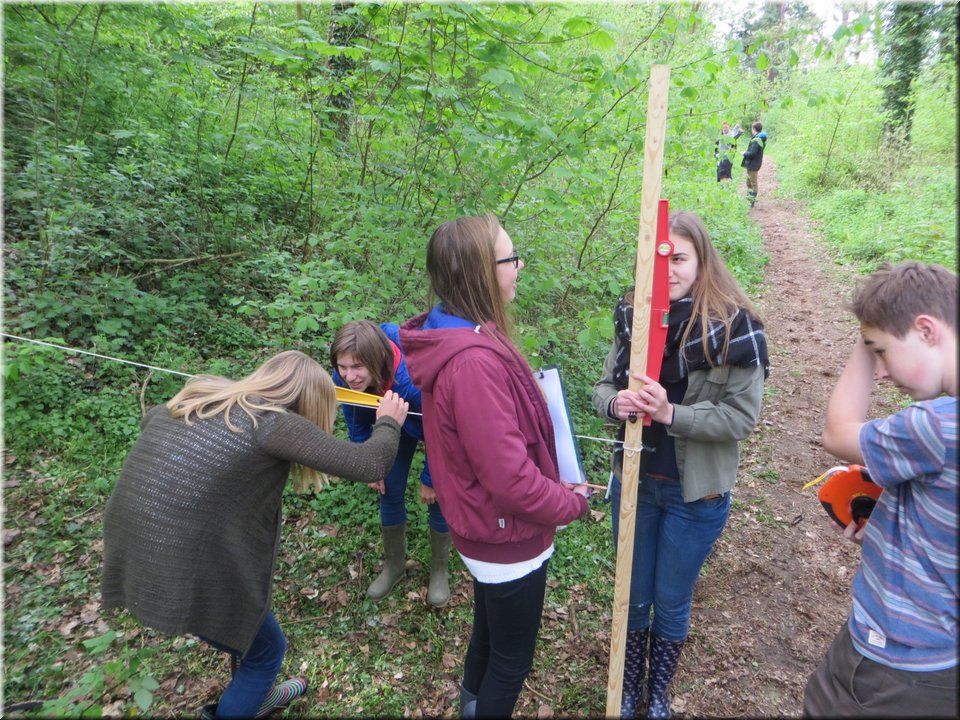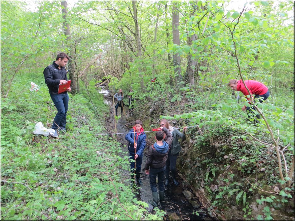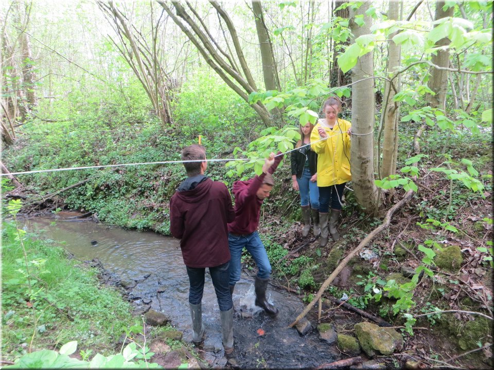 Ze moesten zelf de handen uit de mouwen steken om een aantal opmetingen te verrichten. Aan de hand van een touw en loodrechte stok bepaalden ze bijvoorbeeld het hellingspercentage van een helling. Met behulp van kurk, een chronometer en een rolmeter werd dan weer de stroomsnelheid van water gemeten. Hoe onze leerlingen het ervan af brachten, kan je zien op de foto’s…