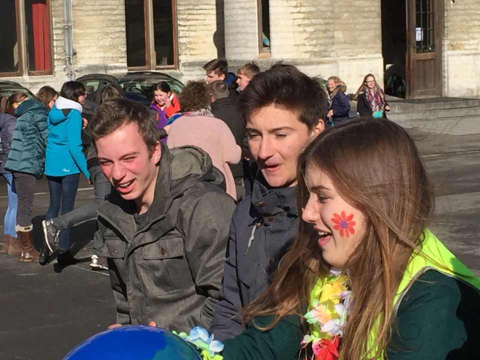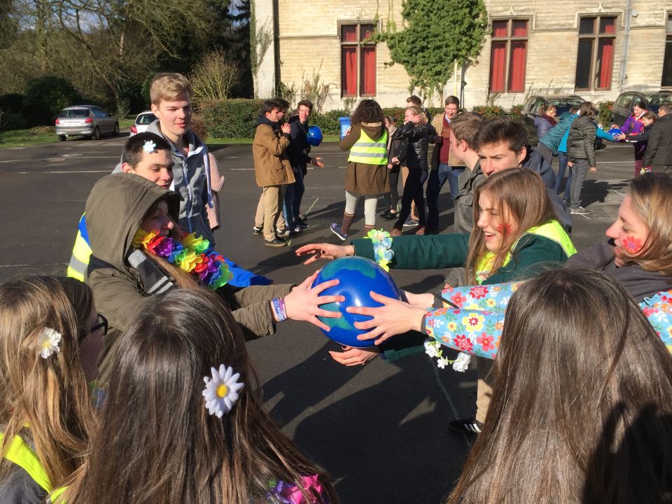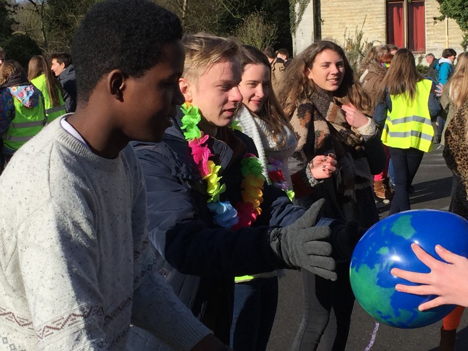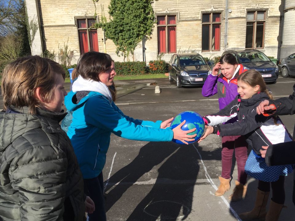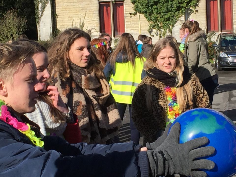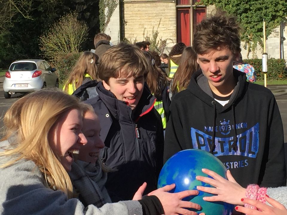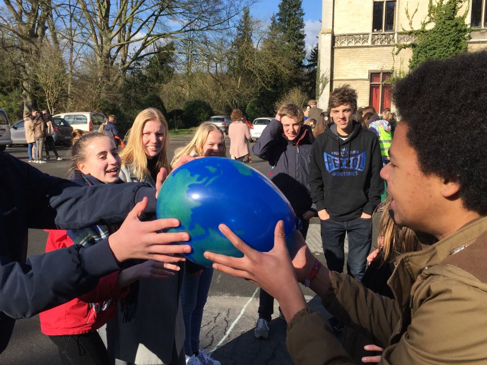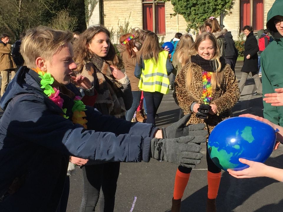 Tijdens het eerste lesuur namen alle klassen deel aan de grote klimaatquiz. En al onze eerstejaarsleerlingen kregen bladwijzers met tips voor minder CO2-productie. Om het warm te houden was er de eerste speeltijd een opwarmdans en ’s middags speelden we het spel ’We laten de wereld niet vallen’.