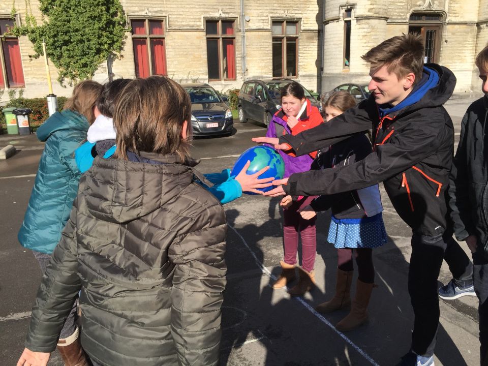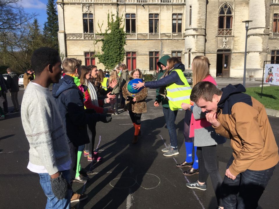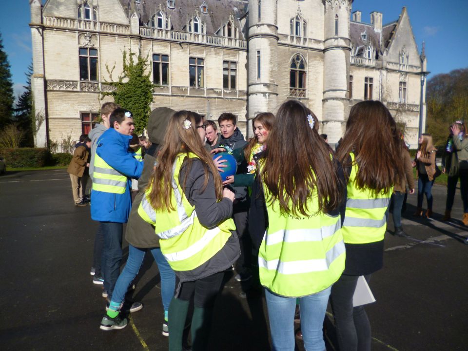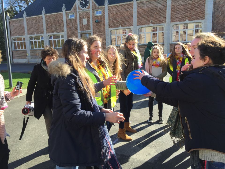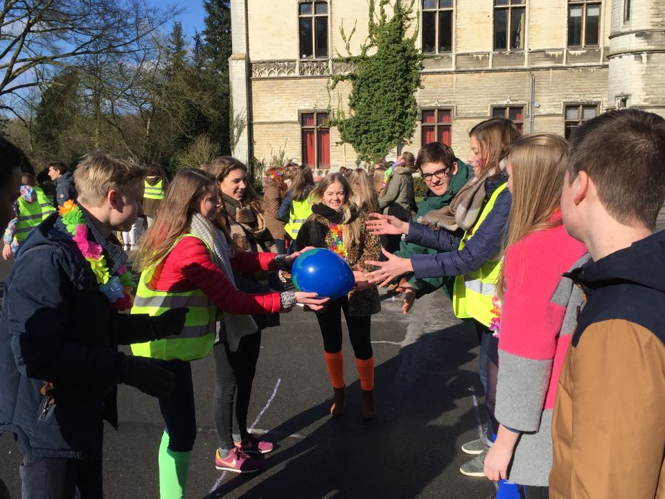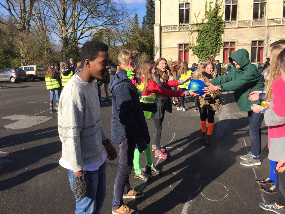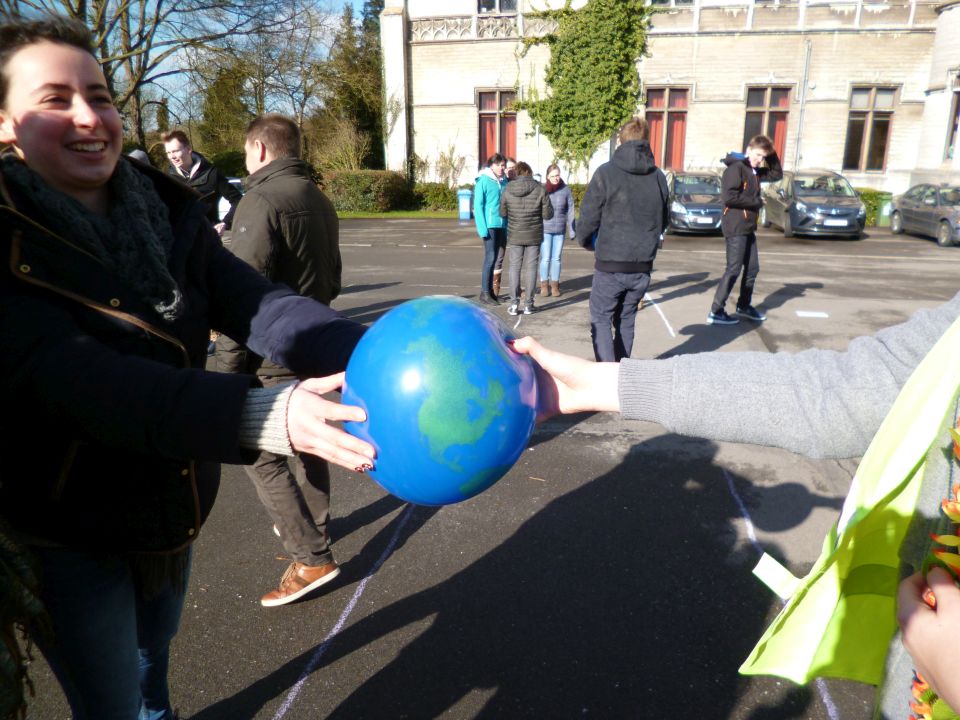 Tijdens het eerste lesuur namen alle klassen deel aan de grote klimaatquiz. En al onze eerstejaarsleerlingen kregen bladwijzers met tips voor minder CO2-productie. Om het warm te houden was er de eerste speeltijd een opwarmdans en ’s middags speelden we het spel ’We laten de wereld niet vallen’.