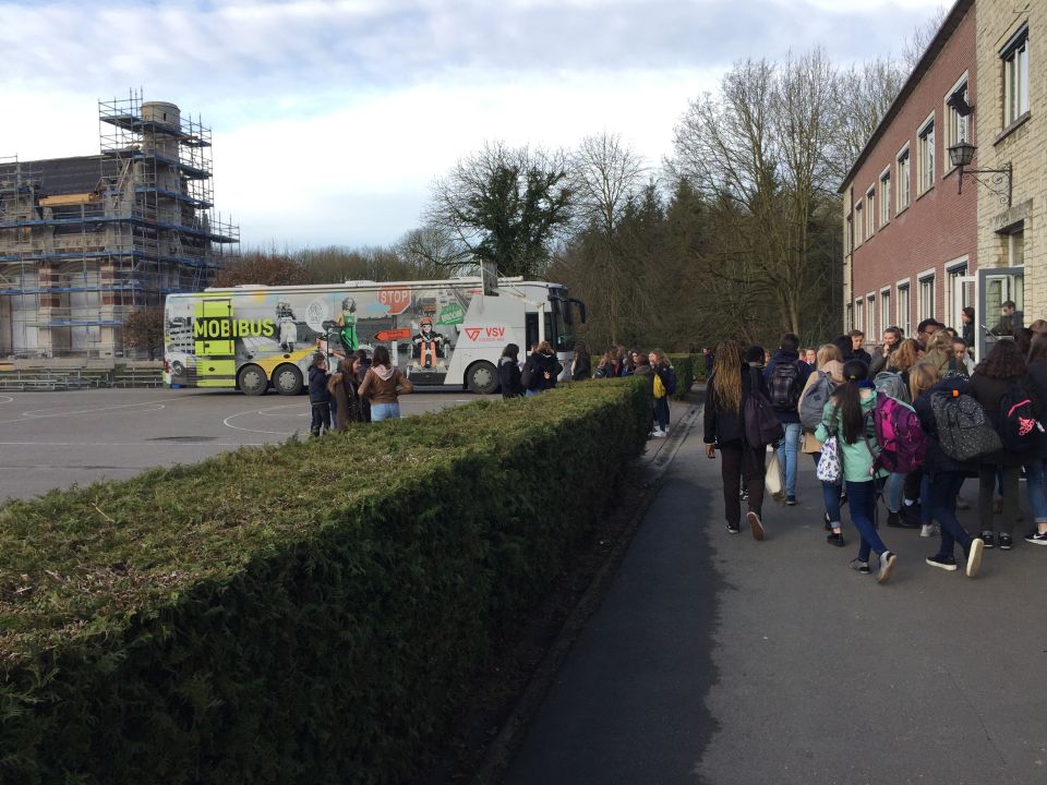 Onze derdejaars werden op maandag 12 maart 2018 op een ludieke wijze bewuster gemaakt van de gevaren in het verkeer. De Mobibus is een omgebouwde bus die door heel Vlaanderen toert om leerlingen van de tweede graad te informeren. Hij bevat een mobiele tentoonstelling over verkeer en veiligheid.